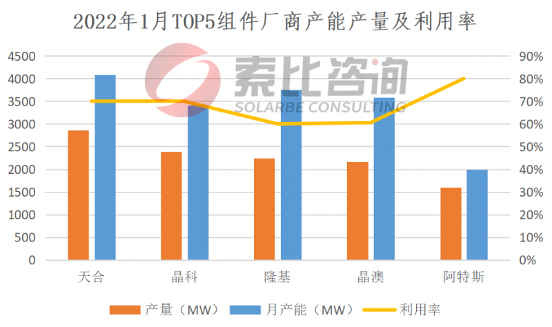 2022年1月,終端需求大幅上升,國內(nèi)組件產(chǎn)量19.73GW,環(huán)比大增23.31%。按照產(chǎn)量排名,天合、晶科、隆基、晶澳、阿特斯位列前五,企業(yè)總產(chǎn)量11.27GW,占比57.12%,綜合開工率68.11%。預計2022年2月,海外需求還會有所提升,組件產(chǎn)量預計持平或小幅上漲。