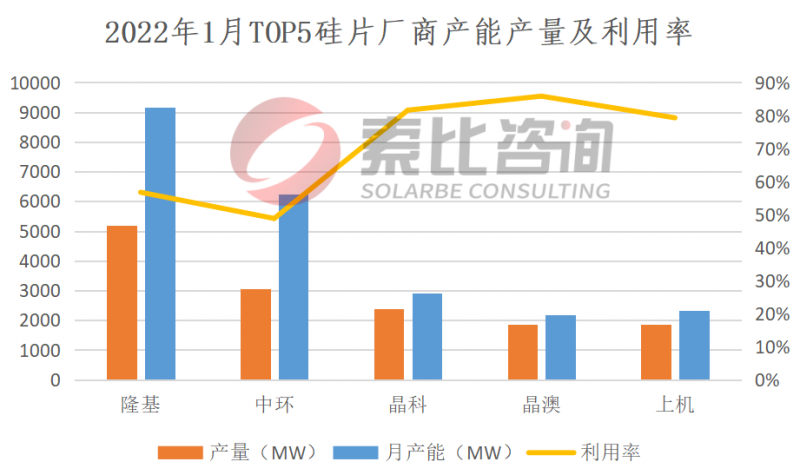 2022年1月,國內(nèi)12家多晶硅企業(yè)在產(chǎn),大全和永祥新增產(chǎn)能陸續(xù)釋放,產(chǎn)量再創(chuàng)新高。1月份國內(nèi)多晶硅產(chǎn)量為5.2萬噸(約20.54GW),環(huán)比增長6.56%。按照產(chǎn)量排名,永祥、協(xié)鑫、大全、新特、東方希望位列前五,企業(yè)總產(chǎn)量4.51萬噸,占比86.7%,綜合利用率90.6%。索比咨詢預期2月份硅料產(chǎn)量繼續(xù)小幅上漲。從供應端來看,1月份新特、大全、永祥、協(xié)鑫擴產(chǎn)增量繼續(xù)釋放。從需求端來看,國內(nèi)和海外市場一季度終端需求受訂單延期和免稅期截止等因素影響,相較往年將有一定程度增長;此外,硅片企業(yè)迅速提升開工率,硅料需求短期內(nèi)大幅增加。