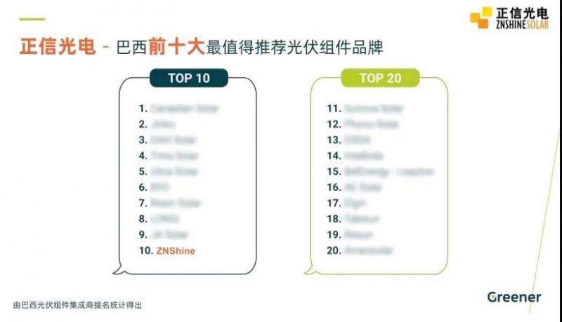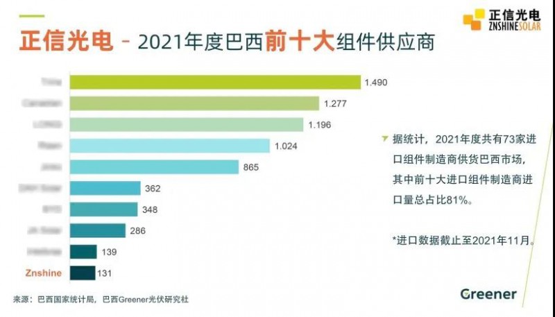 根據巴西國家統計局及巴西權威光伏研究社Greener的最新統計,正信光電以堅挺的組件出口業(yè)績,再次名列2021年度巴西前十大組件供應商。