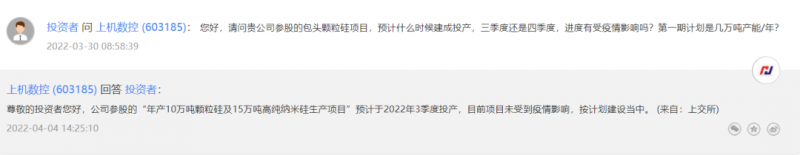 上機(jī)數(shù)控(603185.SH)4月4日在投資者互動(dòng)平臺表示,公司參股的“年產(chǎn)10萬噸顆粒硅及15萬噸高純納米硅生產(chǎn)項(xiàng)目”預(yù)計(jì)于2022年3季度投產(chǎn),目前項(xiàng)目未受到疫情影響,按計(jì)劃建設(shè)當(dāng)中。