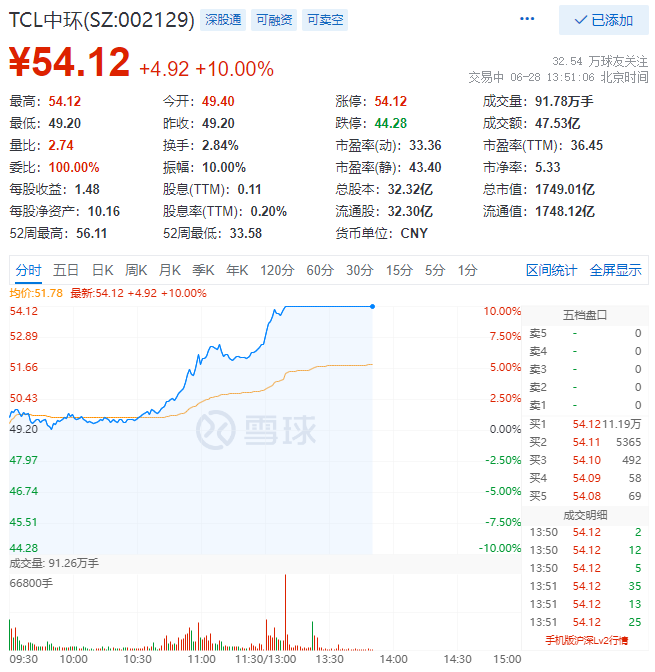 6月28日,TCL中環(huán)(SZ:002129)午后強(qiáng)勢(shì)漲停,股價(jià)報(bào)54.12元/股,總市值達(dá)到1749億元,距離歷史前高56.13元/股僅有咫尺之遙!自4月27日低點(diǎn)以來(lái),公司股價(jià)漲幅達(dá)到61%!