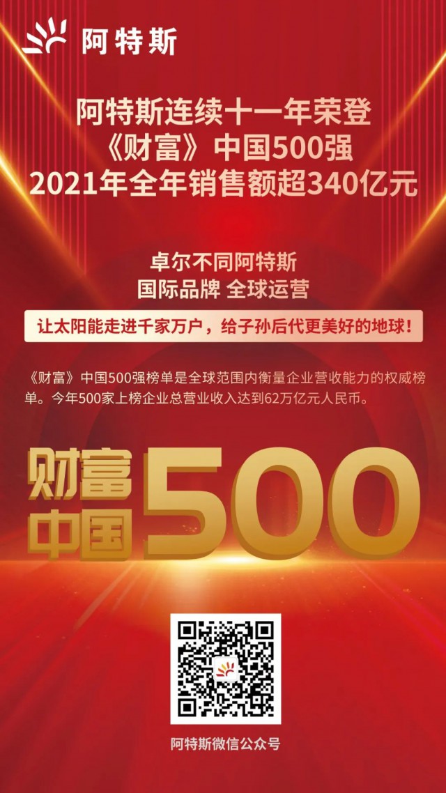 7月12日,財(cái)富中文網(wǎng)發(fā)布2022年《財(cái)富》中國(guó)500強(qiáng)排行榜,阿特斯陽(yáng)光電力集團(tuán)憑借2021年340億元營(yíng)收再次榮登榜單。這是阿特斯集團(tuán)連續(xù)第十一年上榜,充分彰顯了公司高質(zhì)量可持續(xù)發(fā)展的澎湃動(dòng)力。