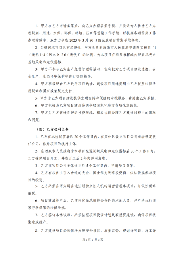 同時(shí)為確保本項(xiàng)目具有經(jīng)濟(jì)性,酒泉市肅州區(qū)人民政府負(fù)責(zé)向酒泉市人民政府申請(qǐng)落實(shí)按照“1(光熱):4(風(fēng)電):2.6(光伏)”的比例,為本項(xiàng)目在酒泉市轄域內(nèi)配置風(fēng)光大基地風(fēng)電和光伏指標(biāo)。