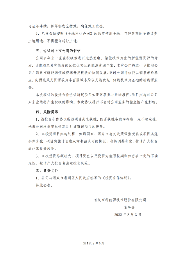 公告顯示,酒泉市肅州區(qū)人民政府在首航高科申請(qǐng)備案后,向首航高科辦理備案手續(xù),并委派專人協(xié)助首航高科辦理規(guī)劃、用地、水保、環(huán)保、林地、壓礦等前期工作手續(xù),以提高各項(xiàng)前期工作辦理的效率,雙方力爭(zhēng)在2023年3月30日前完成項(xiàng)目前期手續(xù)辦理。