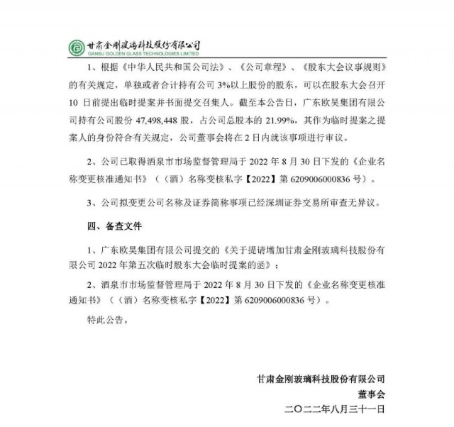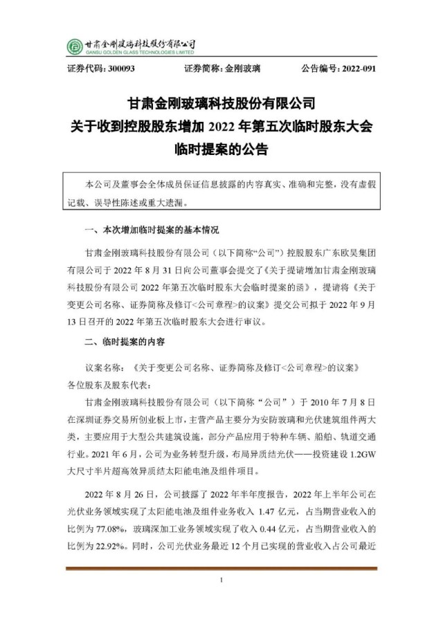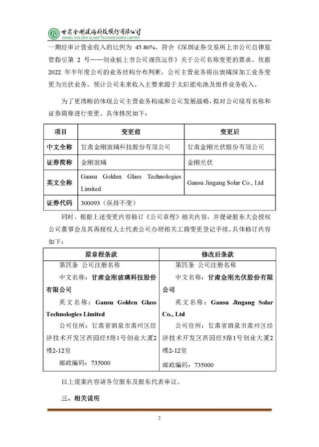 為了更清晰的體現(xiàn)公司主營(yíng)業(yè)務(wù)構(gòu)成和公司發(fā)展戰(zhàn)略,擬對(duì)公司現(xiàn)有名稱和證券簡(jiǎn)稱進(jìn)行變更。上市公司名稱由“甘肅金剛玻璃科技股份有限公司”變更為“甘肅金剛光伏股份有限公司”,證券簡(jiǎn)稱由“金剛玻璃”改為“金剛光伏”,英文全稱由“Gansu Golden Glass Technologies Limited”改為“Gansu Jingang Solar Co., Ltd”。公司董事會(huì)將在兩日內(nèi)就該事項(xiàng)進(jìn)行審議。