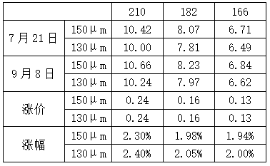 P型硅片方面,按150微米厚度計算,各尺寸報價、漲幅見下表: