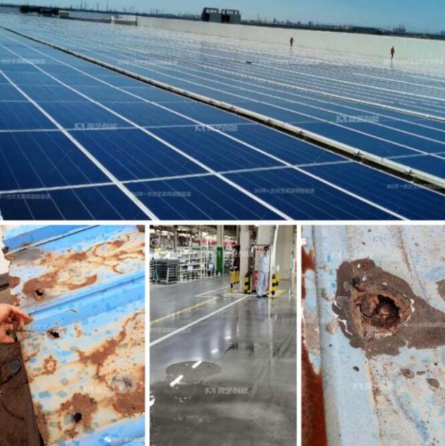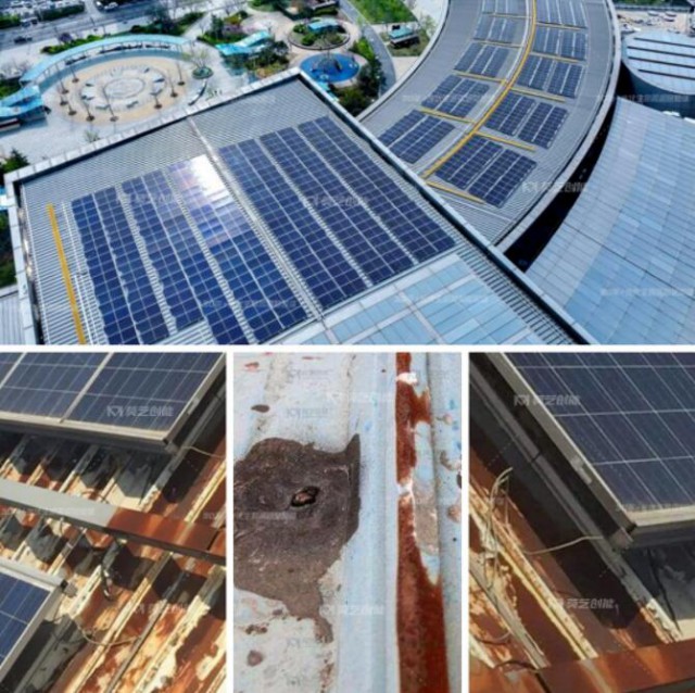 若只依靠彩鋼瓦本身的屋面,很容易因為涂層厚度不夠,加之紫外線、雨水、光合作用等自然因素的侵蝕,造成屋面彩鋼瓦接縫處開裂、鉚釘松動生銹、屋面銹蝕擴大、瓦脊銹蝕銹穿導(dǎo)致屋面出現(xiàn)滲水漏水的情況。同時因其坡度小,可能會造成雨水排泄不暢、積水超過彩鋼瓦接縫高度或鉚釘孔高度及溝沿瓦而導(dǎo)致銹損滲漏。而工廠生產(chǎn)過程中排放的酸性、堿性等氣體長期與屋面接觸,也會腐蝕鋼結(jié)構(gòu),加速銹蝕、穿孔導(dǎo)致滲漏。