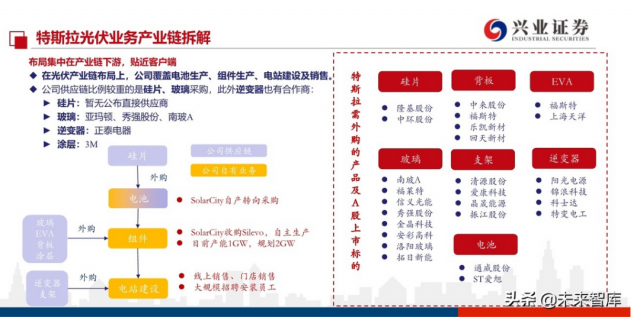據(jù)興業(yè)證券特斯拉光伏業(yè)務(wù)產(chǎn)業(yè)鏈拆解圖可以看出,特斯拉的組件幾乎全都依靠著國內(nèi)廠商。