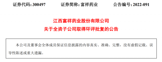 10月21日,江西富祥藥業(yè)股份有限公司發(fā)布公告,近日,公司全資子公司江西如益科技發(fā)展有限公司取得宜春市生態(tài)環(huán)境局下發(fā)的《關(guān)于江西如益科技發(fā)展有限公司搬遷項目環(huán)境影響報告書的批復》(宜環(huán)環(huán)評[2022]90號)。