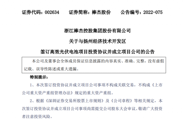 棒杰股份表示結(jié)合自身戰(zhàn)略轉(zhuǎn)型優(yōu)勢及我國光伏產(chǎn)業(yè)快速發(fā)展的機(jī)遇,依托戰(zhàn)略股東 光伏領(lǐng)域的豐富經(jīng)驗(yàn)和揚(yáng)州經(jīng)濟(jì)技術(shù)開發(fā)區(qū)管委會體制創(chuàng)新、發(fā)展活力及產(chǎn)業(yè)政 策支持,投資建設(shè)10GW高效光伏電池片生產(chǎn)基地,實(shí)現(xiàn)公司主營業(yè)務(wù)向光伏業(yè)的戰(zhàn)略轉(zhuǎn)型升級,形成新的利潤增長點(diǎn),為公司業(yè)務(wù)發(fā)展提供有力支持,是公司實(shí)施戰(zhàn)略發(fā)展的重要舉措,對公司未來發(fā)展具有積極意義和推動作用。