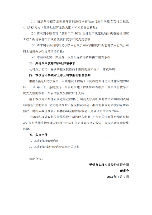 太極實業(yè)表示,鑒于本次訴訟案件正在進展過程中,公司尚無法判斷其對公司本期利潤或期后利潤產(chǎn)生的影響,公司將依據(jù)財產(chǎn)保全情況和會計準則的要求對本次訴訟所涉?zhèn)鶛?quán)計提相應(yīng)減值準備,具體影響金額以年審會計師確認后的結(jié)果為準。值得注意還有,此前8月5日,太極實業(yè)子公司信息產(chǎn)業(yè)電子第十一設(shè)計研究院科技工程股份有限公司(以下稱十一科技)位于烏蘭察布市、鄂爾多斯市、錫林郭勒盟發(fā)展改革委的五個光伏電站項目,共計裝機115 MW,因擅自變更投資主體,上網(wǎng)電價批復(fù)文件被廢止,其光伏補貼遭核查后恐退回,太極實業(yè)也將損失超3億凈利。