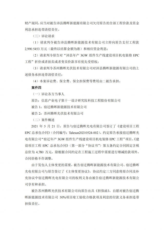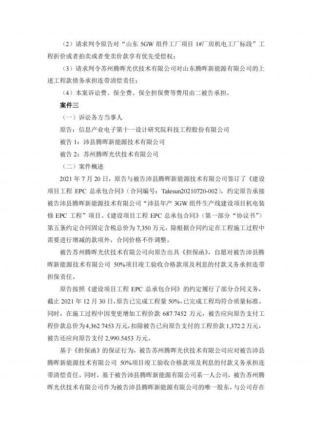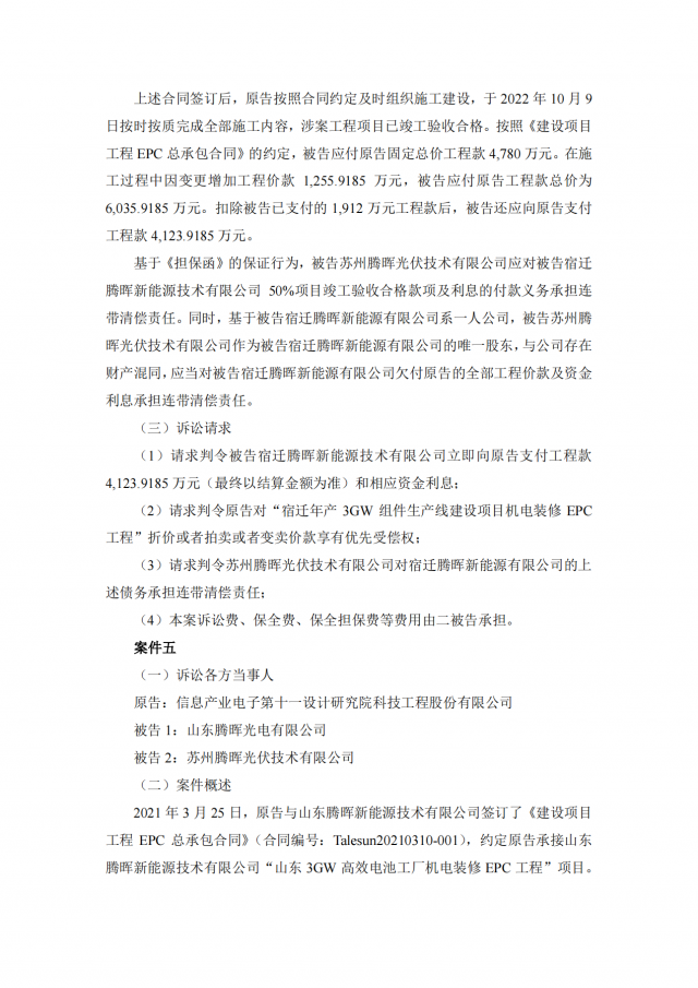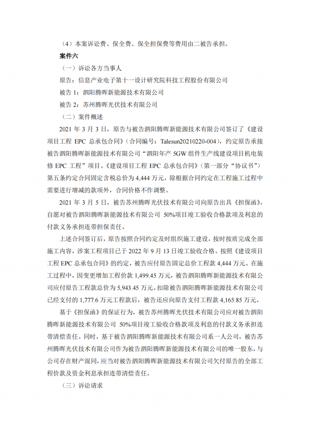 2020年~2021年期,十一科技與蘇州騰暉的六家全資子公司泗陽騰暉光電有限公司、山東騰暉新能源技術(shù)有限公司、沛縣騰暉新能源技術(shù)有限公司、宿遷騰暉新能源技術(shù)有限公司、山東騰暉光電有限公司、泗陽騰暉新能源技術(shù)有限公司簽訂了多筆項目施工承包合同,但上述六家企業(yè)并未全部付清工程款。