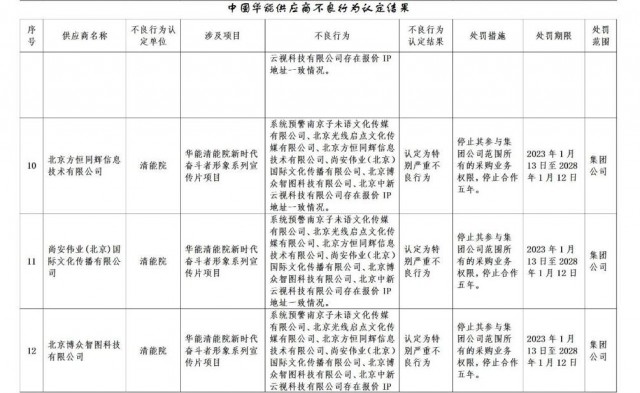 公告稱:為促進(jìn)誠信履約,保證供應(yīng)商產(chǎn)品質(zhì)量、服務(wù)水平,依據(jù)《中國華能集團(tuán)有限公司供應(yīng)商管理辦法》的有關(guān)規(guī)定,對(duì)發(fā)生誠信方面問題的供應(yīng)商進(jìn)行了處理。