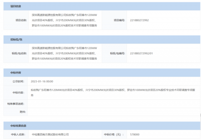 1月30日,深圳高速新能源控股有限公司公示了擬收購廣東陽春市120MW光伏項目40%股權(quán)、興寧市200MW光伏項目30%股權(quán)、羅定市100MW光伏項目20%股權(quán)技術(shù)盡職調(diào)查的中標(biāo)候選人,中檢集團(tuán)南方測試股份有限公司以57.8萬元的報價中標(biāo)。