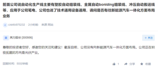 英力股份:公司正積極拓展光伏產(chǎn)業(yè)方向 暫無(wú)新能源汽車一體化方面布局