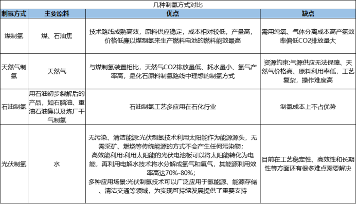 目前,商業(yè)用的氫氣中有96%是從煤、石油和天然氣等化石燃料制取而來,但傳統(tǒng)制氫仍難擺脫對化石能源的依賴。近兩年,光伏制氫技術(shù)發(fā)展勢頭漸顯,其工藝簡單、無污染,被視為制氫最佳路線之一。以下為傳統(tǒng)制氫與光伏制氫方式優(yōu)缺點對比: