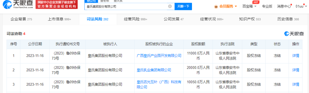 據(jù)天眼查App顯示,近日,皇氏集團(tuán)新增3則股權(quán)凍結(jié)信息,被凍結(jié)股權(quán)數(shù)額合計(jì)約4.1億人民幣,股權(quán)被執(zhí)行企業(yè)為廣西皇氏產(chǎn)業(yè)園開(kāi)發(fā)有限公司、皇氏乳業(yè)集團(tuán)有限公司、皇氏農(nóng)光互補(bǔ)(廣西)科技有限公司,凍結(jié)期限自2023年11月16日至2026年11月15日。