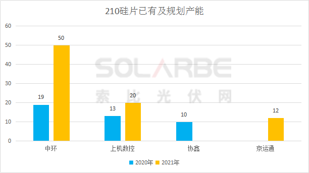 2021年中環(huán)G12硅片產(chǎn)能將從19GW提升至50GW,目前中環(huán)210產(chǎn)品規(guī)?;a(chǎn)良率已超95%,一月份中環(huán)210硅片出貨將超1.4GW,市占率高達(dá)99.5%。2020年11月4日,京運(yùn)通宣布投資70 億元在樂山建設(shè)24GW單晶項(xiàng)目,適配210mm硅片生產(chǎn)線,一期12GW計(jì)劃于2020年第四季度開工建設(shè)。
