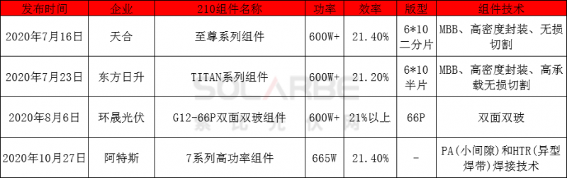 回顧2020年,天合、東方日升、環(huán)晟光伏、阿特斯先后發(fā)布了搭載210尺寸硅片的超高功率組件。2020年3月份,東方日升斬獲全球首個(gè)210尺寸500W組件訂單,成功打進(jìn)歐洲市場(chǎng),并打響了210組件訂單的第一槍。截止2020年第三季度,天合210組件簽單1GW,2021年1月8日,天合與美國(guó)公司NEXTERA ENERGY(新時(shí)代能源)再簽4GW的210組件長(zhǎng)單。