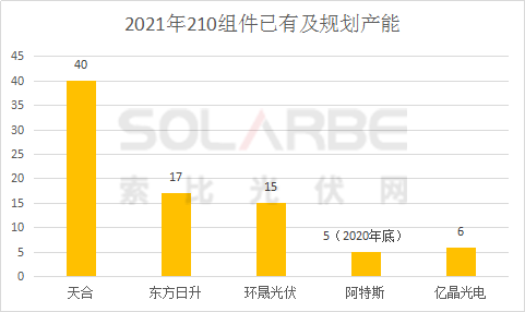 組件端,天合、東方日升、環(huán)晟光伏、阿特斯四家企業(yè)2021年的210組件產(chǎn)能規(guī)劃超83GW。天合在浙江義烏、宿遷、江蘇鹽城建設(shè)了三大210超級(jí)工廠,2020年底天合210組件產(chǎn)能已超22GW,2021年在全球產(chǎn)能將超過50GW,其中210產(chǎn)能占比超過80%,在40GW以上。