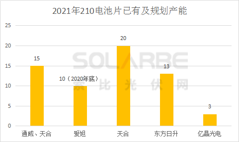電池片端,通威、天合、愛旭、東方日升四家企業(yè)2021年的210電池片產(chǎn)能規(guī)劃超61GW。