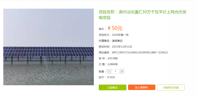 8.7萬張平價光伏綠電交易,也就是8700萬千瓦時電量,等于8700萬度電,如果每張綠證50元,則綠證收入435萬元(該項目已不顯示交易記錄)。