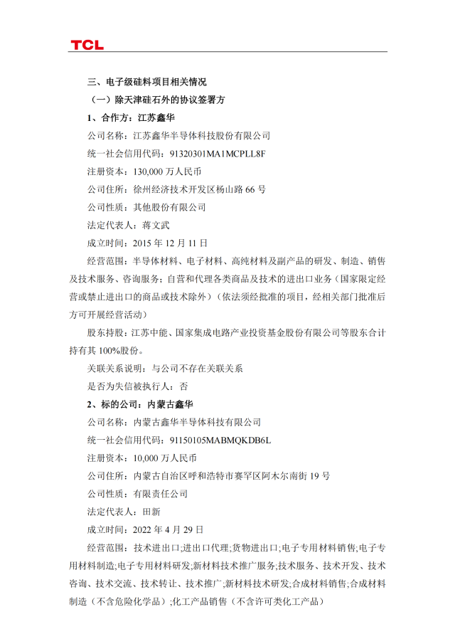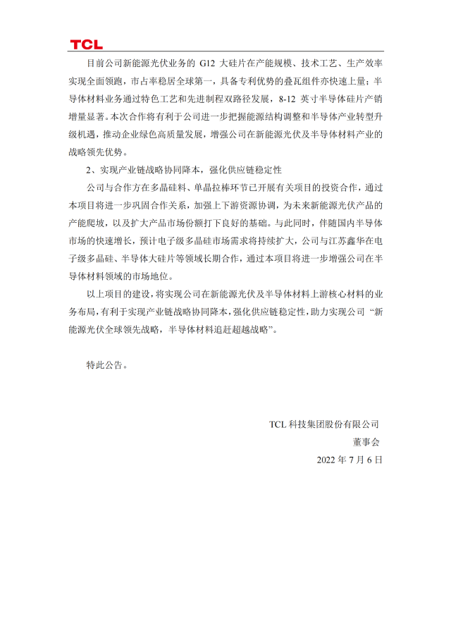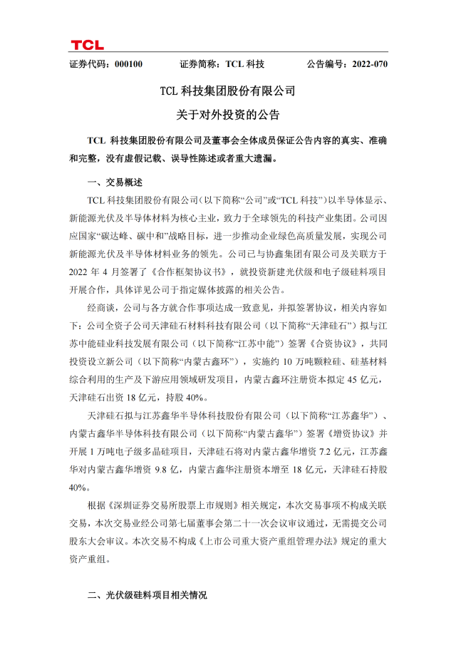 7月7日,TCL科技發(fā)布公告稱,今年4月與協(xié)鑫集團有限公司及關(guān)聯(lián)方簽訂《合作框架協(xié)議書》,就投資新建光伏級和電子級硅料項目開展合作。