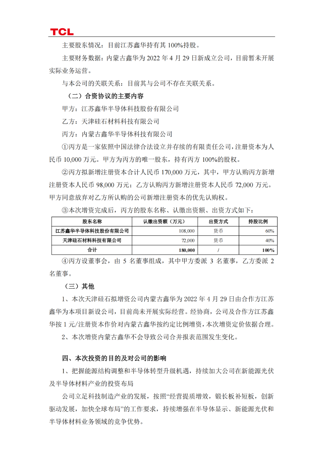 公司與合作方在多晶硅料、單晶拉棒環(huán)節(jié)已開展有關(guān)項目的投資合作,通過本項目將進一步鞏固合作關(guān)系,加強上下游資源協(xié)調(diào),為未來新能源光伏產(chǎn)品的產(chǎn)能爬坡,以及擴大產(chǎn)品市場份額打下良好的基礎(chǔ)。與此同時,伴隨國內(nèi)半導(dǎo)體市場的快速增長,預(yù)計電子級多晶硅市場需求將持續(xù)擴大,公司與江蘇鑫華在電子級多晶硅、半導(dǎo)體大硅片等領(lǐng)域長期合作,通過本項目將進一步增強公司在半導(dǎo)體材料領(lǐng)域的市場地位。