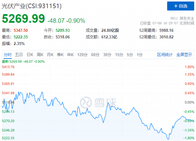 7月6日,光伏板塊迎來(lái)分化行情,中證光伏產(chǎn)業(yè)指數(shù)(CSI:931151)早盤(pán)在金剛線、組件、逆變器、設(shè)備個(gè)股的帶動(dòng)下創(chuàng)出近期反彈新高,隨后硅料、硅片個(gè)股震蕩下跌,拖累指數(shù)盤(pán)中跌幅一度達(dá)到1.78%。截至收盤(pán),中證光伏產(chǎn)業(yè)指數(shù)報(bào)收5270點(diǎn),跌幅收窄至0.9%。