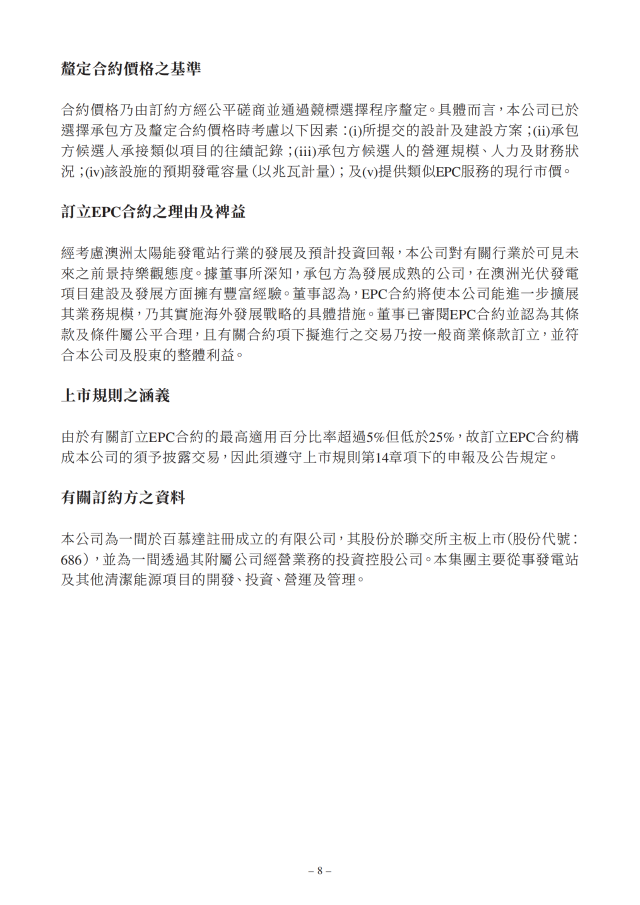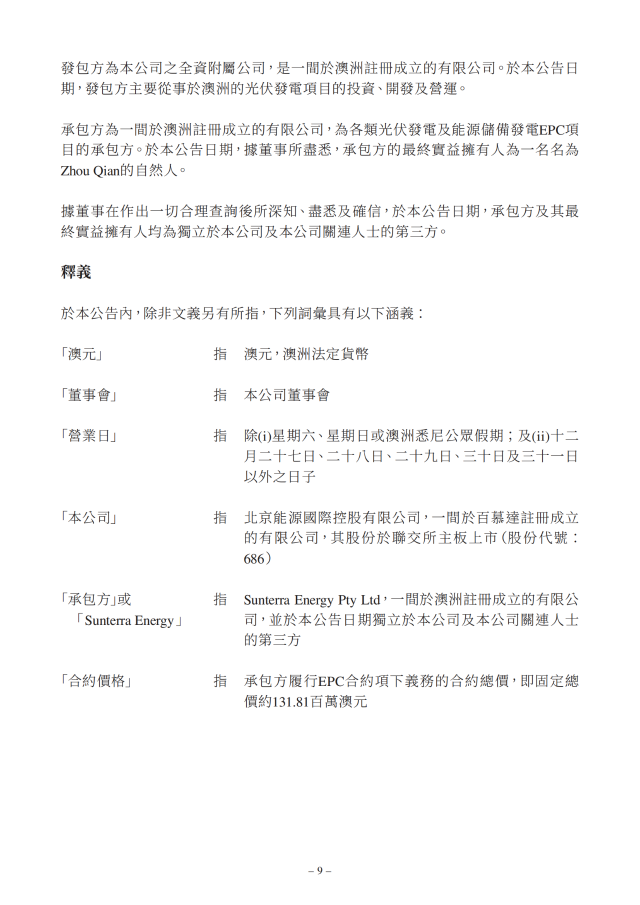 北京能源國際在公告中表示,經(jīng)考慮澳洲太陽能發(fā)電站行業(yè)的發(fā)展及預計投資回報,公司對有關行業(yè)于可見未來的前景持樂觀態(tài)度。據(jù)董事所深知,承包方為發(fā)展成熟的公司,在澳洲光伏發(fā)電項目建設及發(fā)展方面擁有豐富經(jīng)驗。董事認為,EPC合約將使公司能進一步擴展其業(yè)務規(guī)模,乃其實施海外發(fā)展戰(zhàn)略的具體措施。董事已審閱EPC合約并認為其條款及條件屬公平合理,且有關合約項下擬進行的交易乃按一般商業(yè)條款訂立,并符合公司及股東的整體利益。