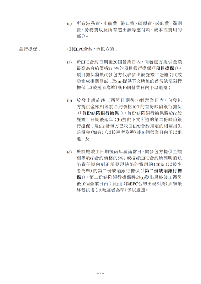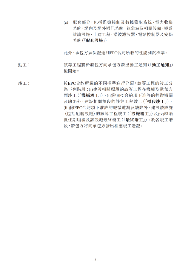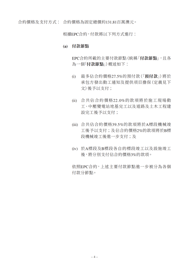 此EPC合約的合約價格約為1.32億澳元,當前匯率折算約合6.17億元人民幣,設施為EPC合約項下的173.1兆瓦太陽能發(fā)電站內(nèi)設施的設計、工程、采購、供應、建設、安裝、測試、委托及移交進行的全部工程及服務。