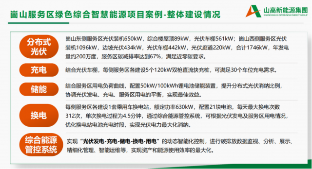 舉例來說,崮山服務(wù)案區(qū)綠色綜合智慧能源項目位于濟南長清區(qū)京臺高速段,占地約260 畝,其中,東側(cè)服務(wù)區(qū)較為狹長,西側(cè)服務(wù)區(qū)背靠崮 云湖,周邊旅游資源豐富,西側(cè)服務(wù)區(qū)內(nèi)已建成酒店和觀光廊道。崮山服務(wù)區(qū)年用電量約300萬度,折合年碳排放量約2653噸,服務(wù)區(qū)當(dāng)前變壓器總?cè)萘繛?500kVA。崮山服務(wù)區(qū)已建成充電樁共8個、污水處理設(shè)施、多聯(lián)機中央空調(diào)系統(tǒng)等,本次建設(shè)內(nèi)容包括分布式光伏、 儲能、充電站、換電站、綜合能源管理系統(tǒng)等。實現(xiàn)“光伏發(fā)電-充電-儲電-換電-用電”的動態(tài)智能化控制,進行碳排放數(shù)據(jù)監(jiān)視、分析、展示、精細化管理、智能運維等,實現(xiàn)資產(chǎn)和能源使用效率的最大化。