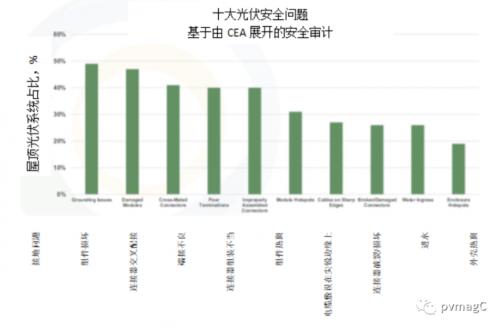 CEA發(fā)現(xiàn),接地問題大多發(fā)生在逆變器或設備焊盤、光伏陣列塊和組件橫排之間以及延伸的導管沿線,這些構成最常見的安全問題。該公司還發(fā)現(xiàn),組件損壞通常是由于安裝或清潔方法不當造成的,包括在組件上行走以及遭遇冰雹或大風等極端氣候事件。