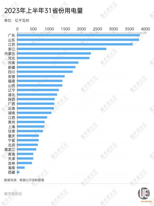 廣東、山東、江蘇全社會用電量在3000億千瓦時階段“三雄相爭”,浙江、內蒙古和河北競速2000億千瓦時階段,而剩下的河南、新疆等12個全社會用電量達到千億千瓦時的省份,只能爭奪剩下的4個席位。