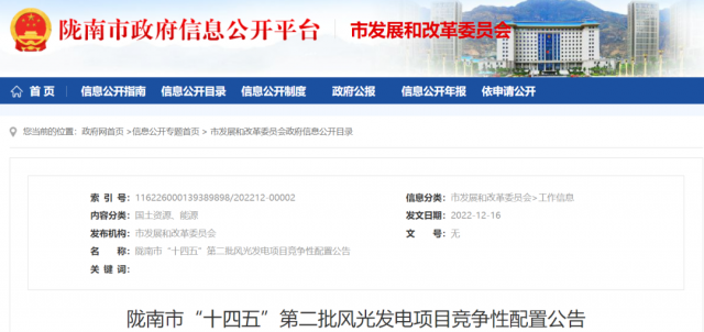 12月16日,隴南市發(fā)布“十四五”第二批風(fēng)光發(fā)電項(xiàng)目競(jìng)爭(zhēng)性配置公告。