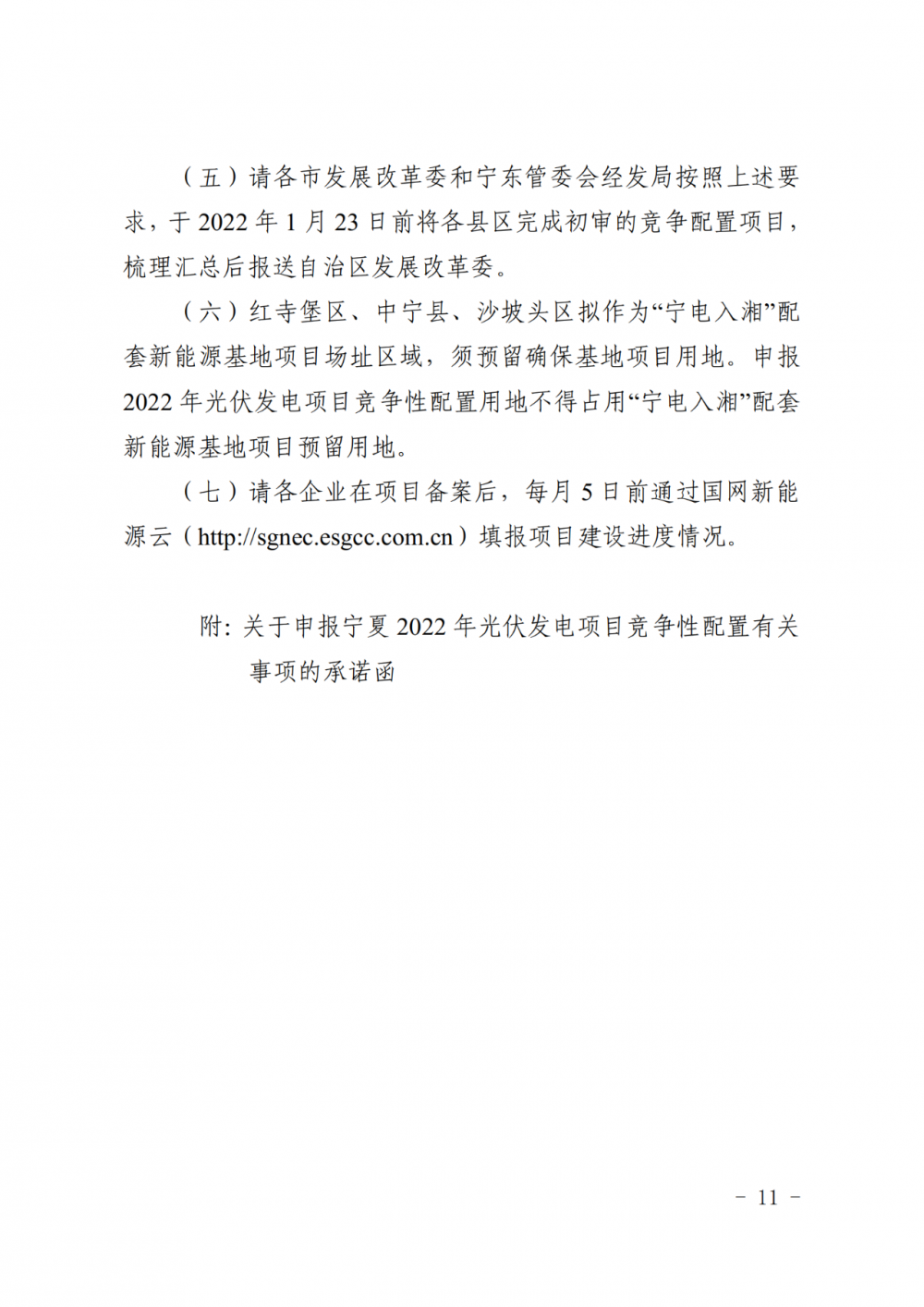 紅寺堡區(qū)、中寧縣、沙坡頭區(qū)擬作為“寧電入湘”配套新能源基地項目場址區(qū)域,須預(yù)留確?;仨椖坑玫?。申報2022年光伏發(fā)電項目競爭性配置用地不得占用“寧電入湘”配套新能源基地項目預(yù)留用地。