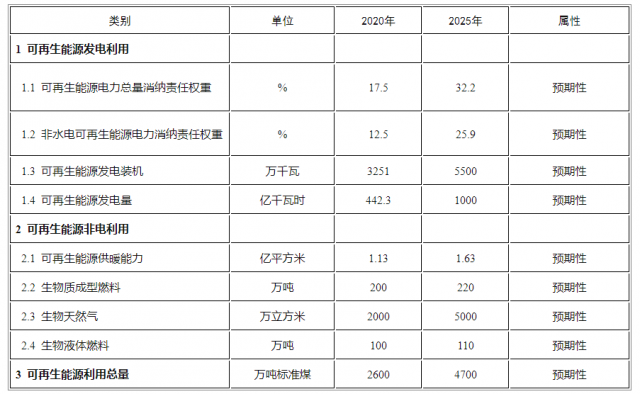 ——可再生能源總量目標(biāo)?!笆奈濉逼陂g,可再生能源在一次能源消費增量中占比超過50%,到2025年,可再生能源消費總量達到4700萬噸標(biāo)煤左右。非化石能源占一次能源消費總量比重16%左右。
