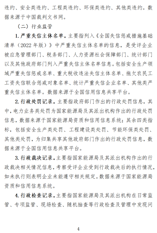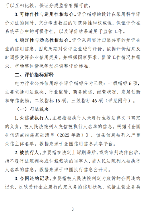 近日,國家能源局印發(fā)《電力行業(yè)公共信用綜合評價標(biāo)準(zhǔn)(試行)》的通知(國能發(fā)資質(zhì)規(guī)〔2023〕28號),明確提出“電力行業(yè)公共信用綜合評價指標(biāo)分為三級:一級指標(biāo)6項(xiàng),主要包括司法裁決、行業(yè)監(jiān)管、商務(wù)誠信、經(jīng)營狀況、發(fā)展創(chuàng)新和守信激勵,二級指標(biāo)16項(xiàng),三級指標(biāo)46項(xiàng)”。原文如下: