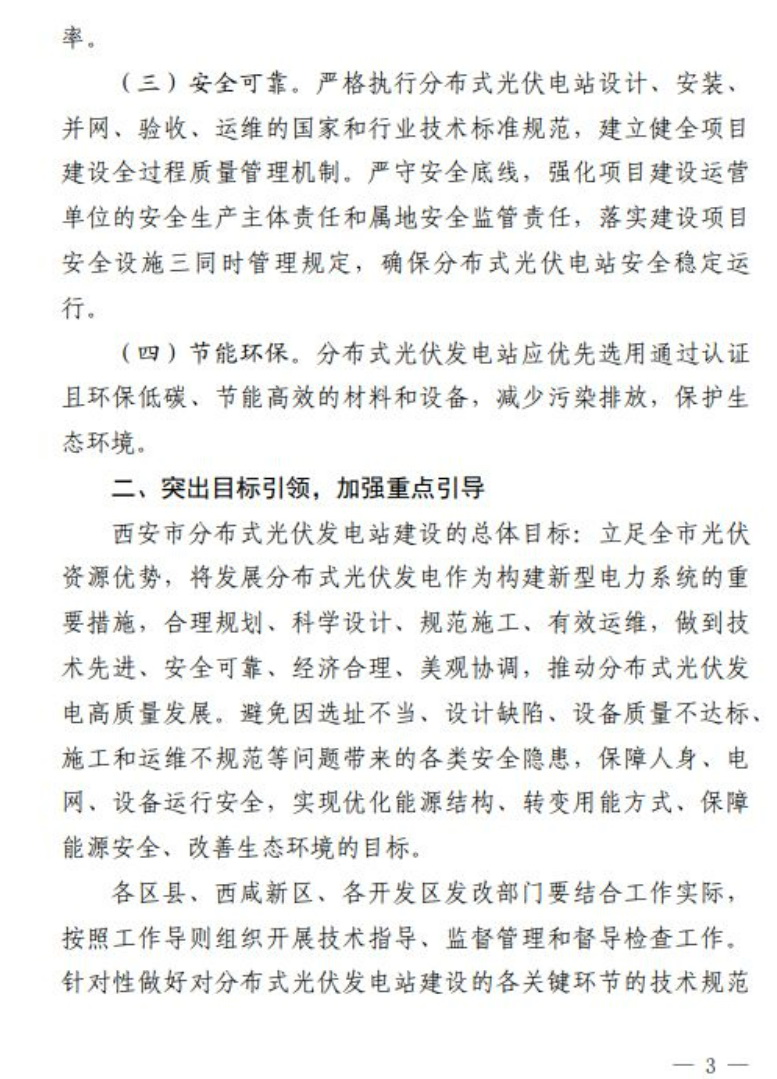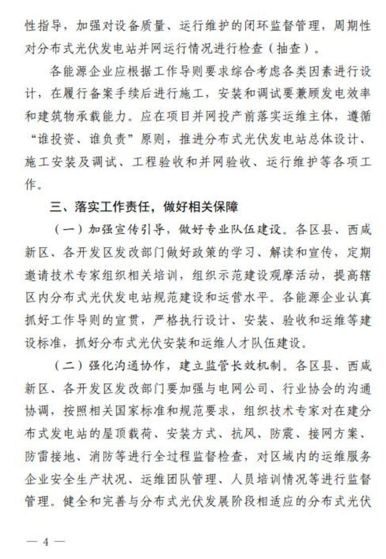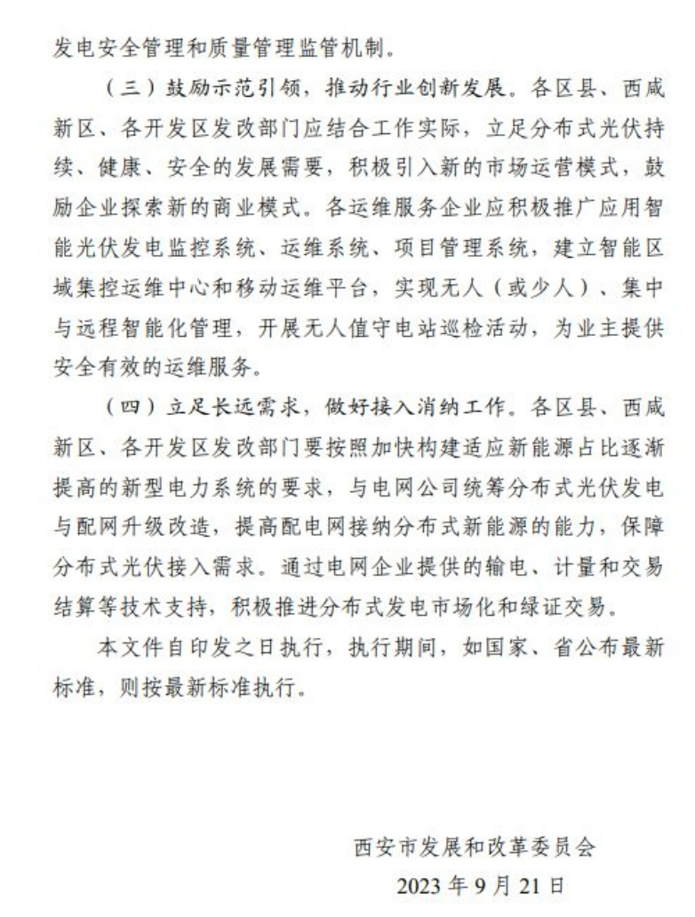 9月21日,西安市發(fā)改委發(fā)布《推進西安市分布式光伏電站建設(shè)工作導則(試行)》的通知,分布式光伏發(fā)電站可采用“自發(fā)自用”“自發(fā)自用,余電上網(wǎng)”或者“全額上網(wǎng)”等并網(wǎng)模式,所有新建、擴建或改建的分布式光伏發(fā)電站,履行項目備案、設(shè)計、安裝和驗收程序;戶用(自然人)分布式光伏發(fā)電站裝機容量原則上不超過50kW,且不得超過超出宅基地范圍;非自然人分布式光伏發(fā)電站單點并網(wǎng)裝機容量不超過6000kW,整村開發(fā)模式在電網(wǎng)無消納受限的區(qū)域,不設(shè)容量規(guī)模限制。