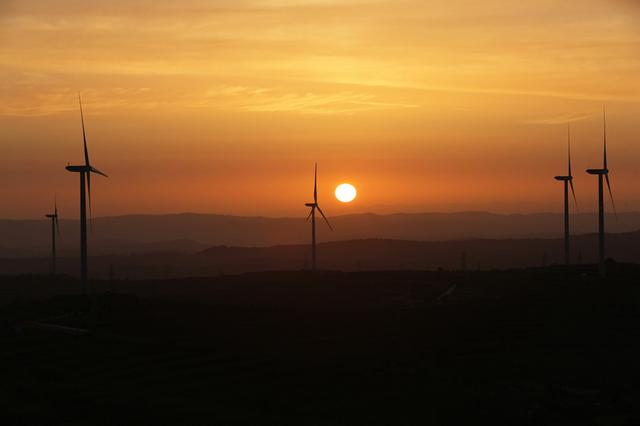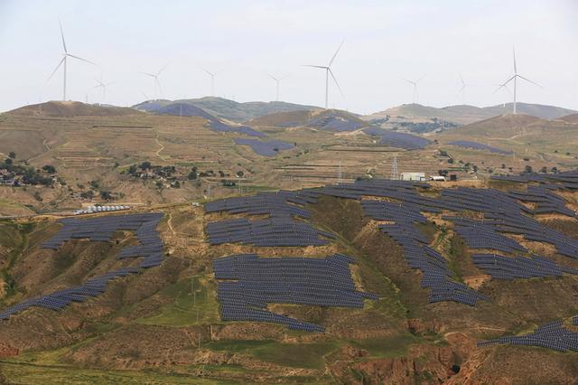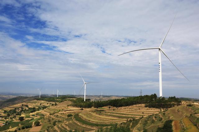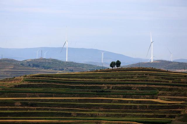 夏日時節(jié),在位于黃土高原的甘肅省定西市,風(fēng)電基地風(fēng)機迎風(fēng)旋轉(zhuǎn),與梯田、村莊相映成景,蔚為壯觀。