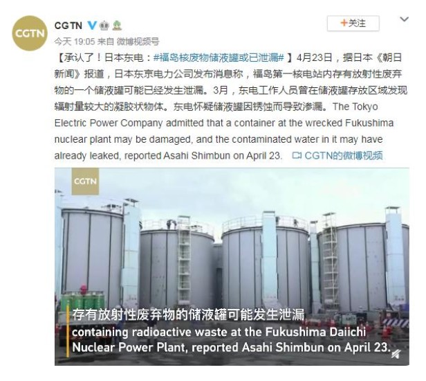 4月23日,據(jù)日本《朝日新聞》報道,日本東京電力公司發(fā)布消息稱,福島第一核電站內存有放射性廢棄物的一個儲液罐可能已經(jīng)發(fā)生泄漏。3月,東電工作人員曾在儲液罐存放區(qū)域發(fā)現(xiàn)輻射量較大的凝膠狀物體。東電懷疑儲液罐因銹蝕而導致滲漏。