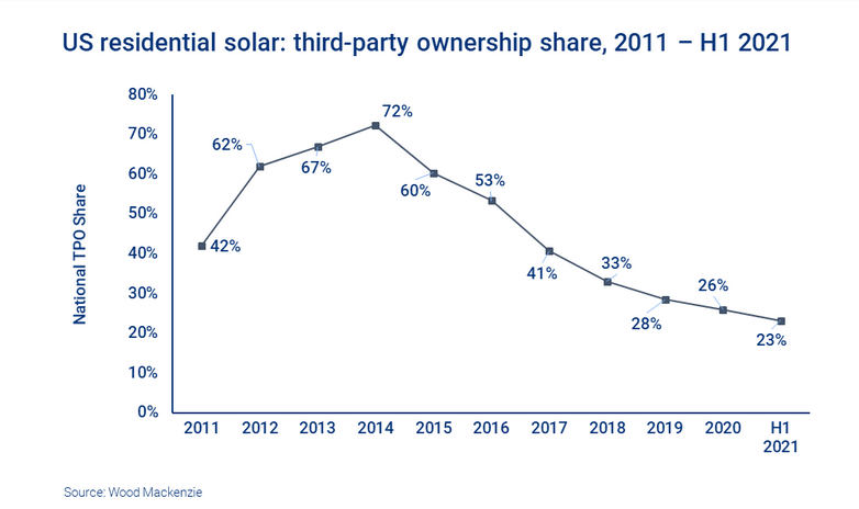 近年來,光伏行業(yè)貸款的增長顯著超過了整體戶用光伏市場(chǎng)的增長。這導(dǎo)致第三方所有權(quán)(TPO)的新項(xiàng)目份額下降。事實(shí)上,TPO份額已從2020年的26%下降到2021年上半年的23%,這是有記錄以來的最低水平。與此同時(shí),貸款份額在同一時(shí)期從55%增加到60%。低利率的長期貸款(25年期,利率為3%或更低)繼續(xù)為客戶提供資金支持,并推動(dòng)市場(chǎng)增長。