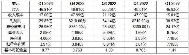 2023財年第一財季凈利潤4.00億美元,去年同期凈利潤為7.18億美元,同比減少44.24%。