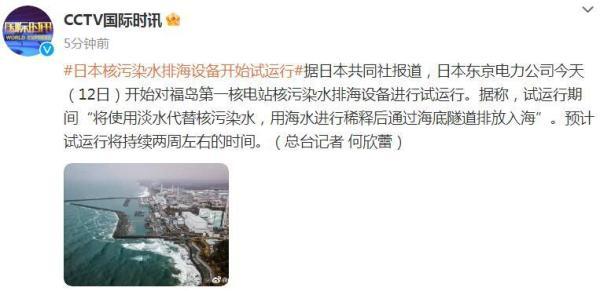 據(jù)日本共同社報(bào)道,日本東京電力公司今天(6月12日)開始對福島第一核電站核污染水排海設(shè)備進(jìn)行試運(yùn)行。據(jù)稱,試運(yùn)行期間“將使用淡水代替核污染水,用海水進(jìn)行稀釋后通過海底隧道排放入海”。預(yù)計(jì)試運(yùn)行將持續(xù)兩周左右的時(shí)間。