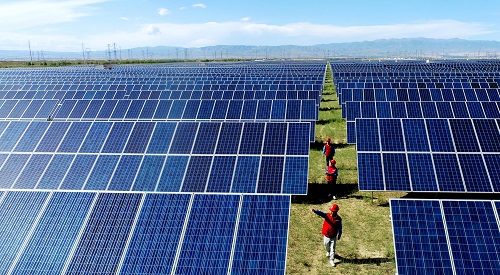 國(guó)網(wǎng)青海電力員工在海南州光伏產(chǎn)業(yè)園區(qū)檢查設(shè)備運(yùn)行情況。
