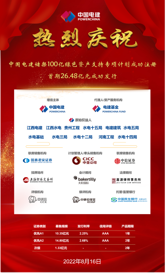 近日,“中國電建2022年第1-10期綠色資產(chǎn)支持專項(xiàng)計(jì)劃”取得上海證券交易所批復(fù),綠色儲架規(guī)模達(dá)100億元。本項(xiàng)目以電建股份成員單位持有的綠色應(yīng)收款項(xiàng)為基礎(chǔ)資產(chǎn),由電建股份作為增信機(jī)構(gòu),電建基金作為代理人統(tǒng)一歸集基礎(chǔ)資產(chǎn)并發(fā)行綠色資產(chǎn)支持證券。一次儲架分次發(fā)行和基金公司代理人模式為電建成員單位提供了壓降“兩金”、降低資產(chǎn)負(fù)債率的便捷高效新渠道。