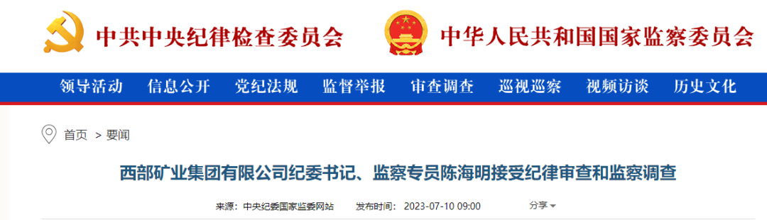 中央紀委國家監(jiān)委網(wǎng)站7月10日消息,據(jù)青海省紀委監(jiān)委消息:西部礦業(yè)集團有限公司黨委委員、紀委書記、監(jiān)察專員,青海省紀委委員陳海明涉嫌嚴重違紀違法,目前正接受青海省紀委監(jiān)委紀律審查和監(jiān)察調(diào)查。