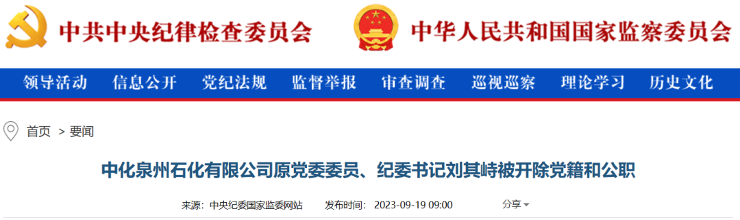 中央紀委國家監(jiān)委網(wǎng)站9月19日消息,據(jù)中國中化控股有限責任公司紀檢監(jiān)察組、福建省紀委監(jiān)委消息:日前,中國中化控股有限責任公司紀檢監(jiān)察組、福建省泉州市監(jiān)委對中化泉州石化有限公司原黨委委員、紀委書記劉其峙嚴重違紀違法問題進行了紀律審查和監(jiān)察調(diào)查。