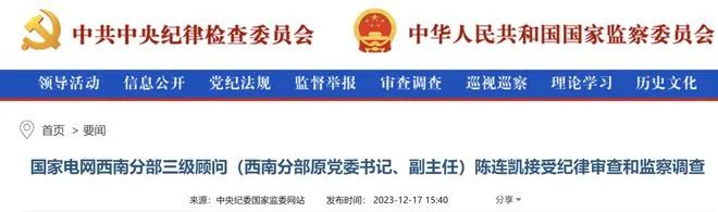 國家電網(wǎng)西南分部三級顧問(西南分部原黨委書記、副主任)陳連凱接受紀(jì)律審查和監(jiān)察調(diào)查