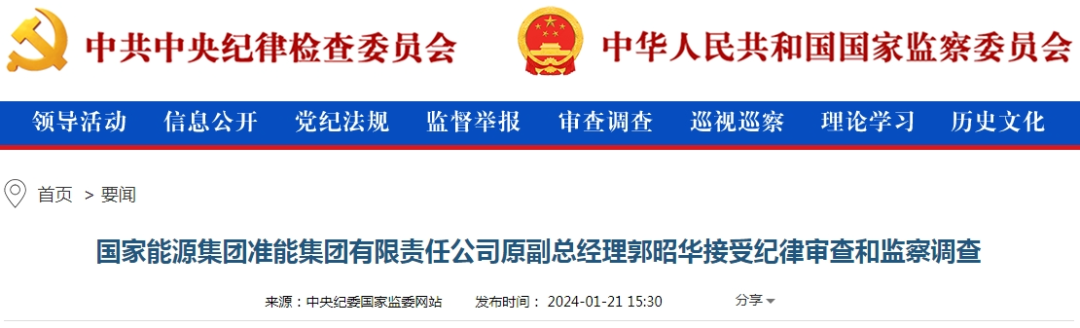 中央紀委國家監(jiān)委網(wǎng)站1月21日消息,據(jù)國家能源集團紀檢監(jiān)察組、山西省紀委監(jiān)委消息:國家能源集團準能集團有限責任公司原副總經(jīng)理郭昭華涉嫌嚴重違紀違法,目前正接受國家能源集團紀檢監(jiān)察組和山西省大同市監(jiān)委紀律審查和監(jiān)察調(diào)查。